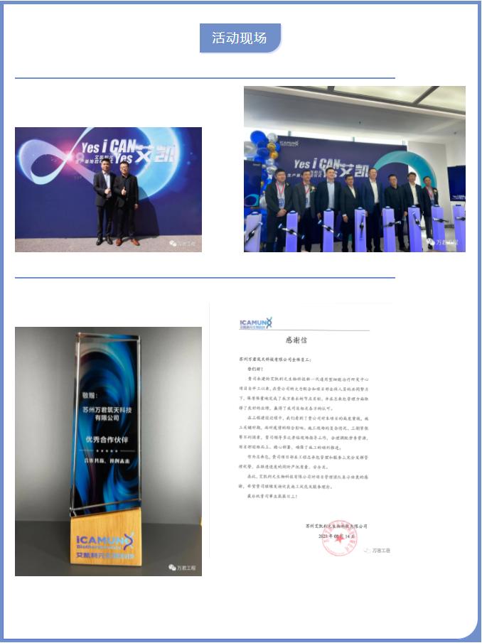 由蘇州萬君筑天科技承建的艾凱利元生物科技新一代通用型細胞治療研發中心項目于2022年9月竣工交付。本項目執行過程包含深化設計、BIM空間管理、設備采購、工程施工、系統調試、(BMS、EMS)驗證等階段。萬君科技秉承著聚賢、謙謹、革新、責任的經營理念,經過105日歷天達成竣工條件,克服了新冠疫情停工和夏日極端天氣等困難,高質量建成了GMP生產基地,包括一條采用蜂巢培養系統實現多批次細胞培養灌裝的生產線,一個基于多功能干細胞(iPSC)的通用型細胞治療藥物開發實驗室。