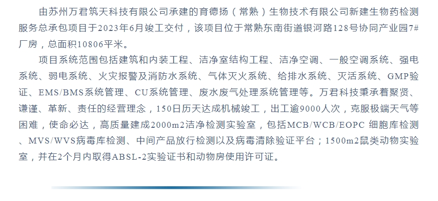 萬君科技承建育德?lián)P(常熟)生物技術(shù)有限公司新建生物藥檢測服務(wù)總承包項(xiàng)目竣工并交付客戶使用